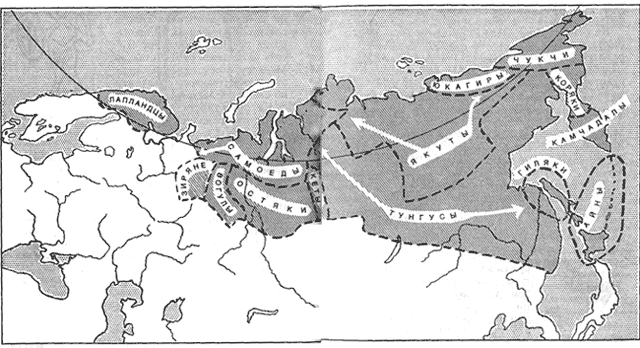 Рис. 52. Карта, на которой показаны регионы, занятые арктическими народами Евразии.