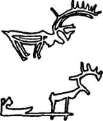 Рис. 53. Два северных оленя, изображенные на барабане: вверху – крупный самец, внизу – животное, которое тащит сани в форме каноэ.