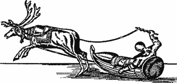 Рис. 17. Гравюра XVII в., на которой показаны сани, запряженные северным оленем. Ясно видна типичная форма челнока саней. След проходит между ногами животного.