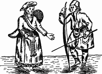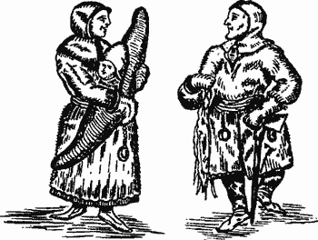 Рис. 19. Гравюра XVII в. с изображением лапландской пары: женщины, держащей в руках люльку с младенцем, и мужчины с топором.