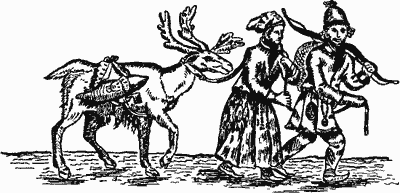 Рис. 20. Гравюра с изображением лапландской пары во время путешествия. Мужчина вооружился большим луком, а женщина ведет оленя; младенец едет в колыбели, привязанной к седлу на спине оленя.