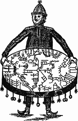Рис. 21. Шаман из области Нордтренделаг с большим барабаном, расписанным многочисленными рисунками и фигурами и украшенным звездами и медными кружками.
