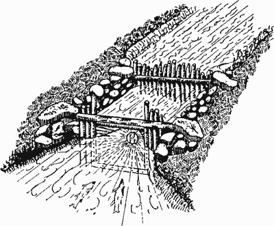Рис. 34. Типичная лапландская барьерная западня в узких местах реки.